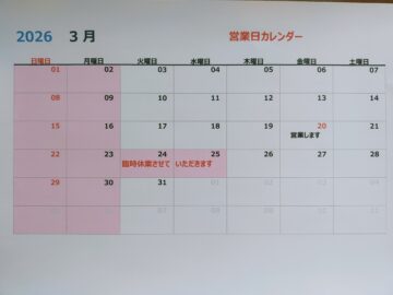 3月の営業日カレンダー 3月20日(金)は営業いたします 3月24日(火)、25日(水)は臨時休業とさせて頂きます 宜しくお願い致します (^ー^) 登録日:2026/03/03| Category お知らせ